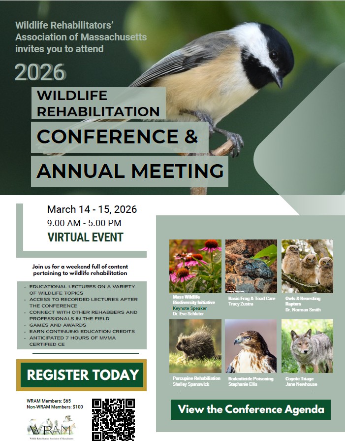 This year’s conference will feature a wide-ranging lineup of presentations that reflect the real, evolving work of wildlife rehabilitation — from species-specific care and medical considerations to best practices, emerging challenges, and the hard-won knowledge that only comes from time in the field. With over 25 hours of continuing education credits available for rehabilitators, and up to 7 hours of MVMA-certified CEUs for veterinarians and CVTs (accreditation in progress), the weekend offers both depth and practical value you can bring back to your work and into the everyday choices we all make when trying to help wildlife.