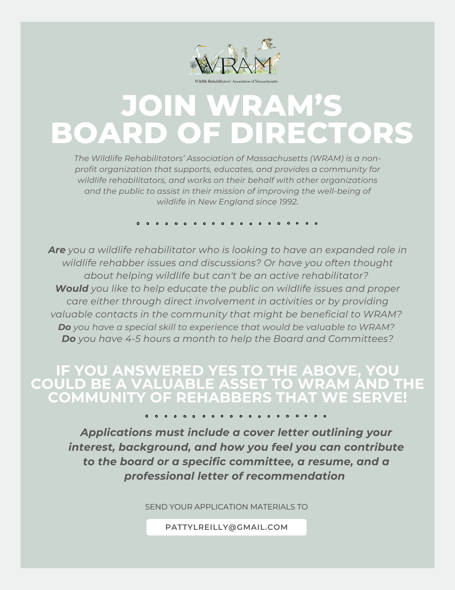 WRAM Board of Directors Open Positions 2025 Brendan Gmyrek January 26, 2023 Continue Reading Previous Previous post: Fall 2022 WRAM Luncheon!Next Next post: Found a baby bird